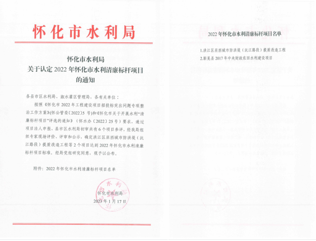 近日,从怀化市水利局传来消息,九游娱乐(NineGame)手游平台(洪江区巫西城市防洪堤沅江路段提质改造工程)喜获“2022年度怀化市水利清廉标杆项目”荣誉,清廉建设取得明显成效和充分认可。